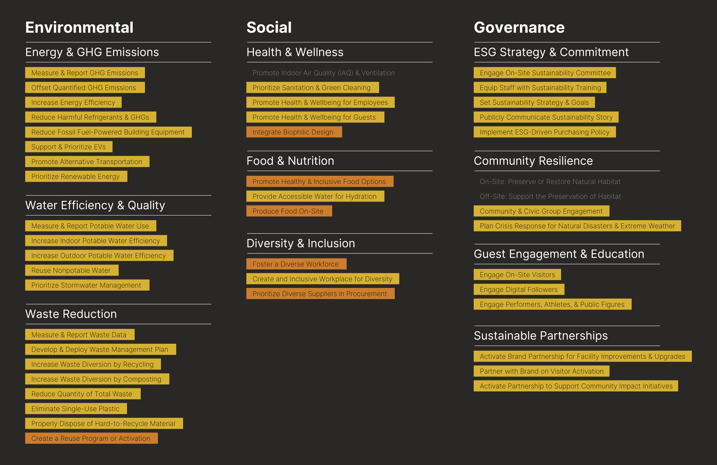 GOAL Medals recognize measurable sustainability achievements across ten categories. The objectives listed below reflect the progress Climate Pledge Arena demonstrated in the current GOAL Medal cycle, highlighting both operational improvements and areas of leadership across the venue.
