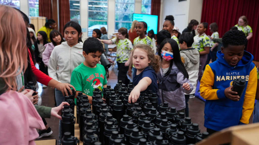 In celebration of Billie Eilish’s 2024 concerts, Climate Pledge Arena and One Roof Foundation funded new water stations and reusable bottles for a local school.