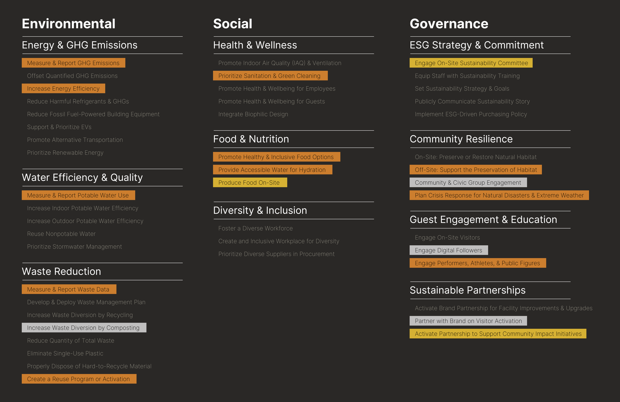 GOAL Medals recognize measurable sustainability achievements across ten categories. The objectives listed below reflect the progress Gainbridge Fieldhouse demonstrated in the current GOAL Medal cycle, highlighting both operational improvements and areas of leadership across the venue.