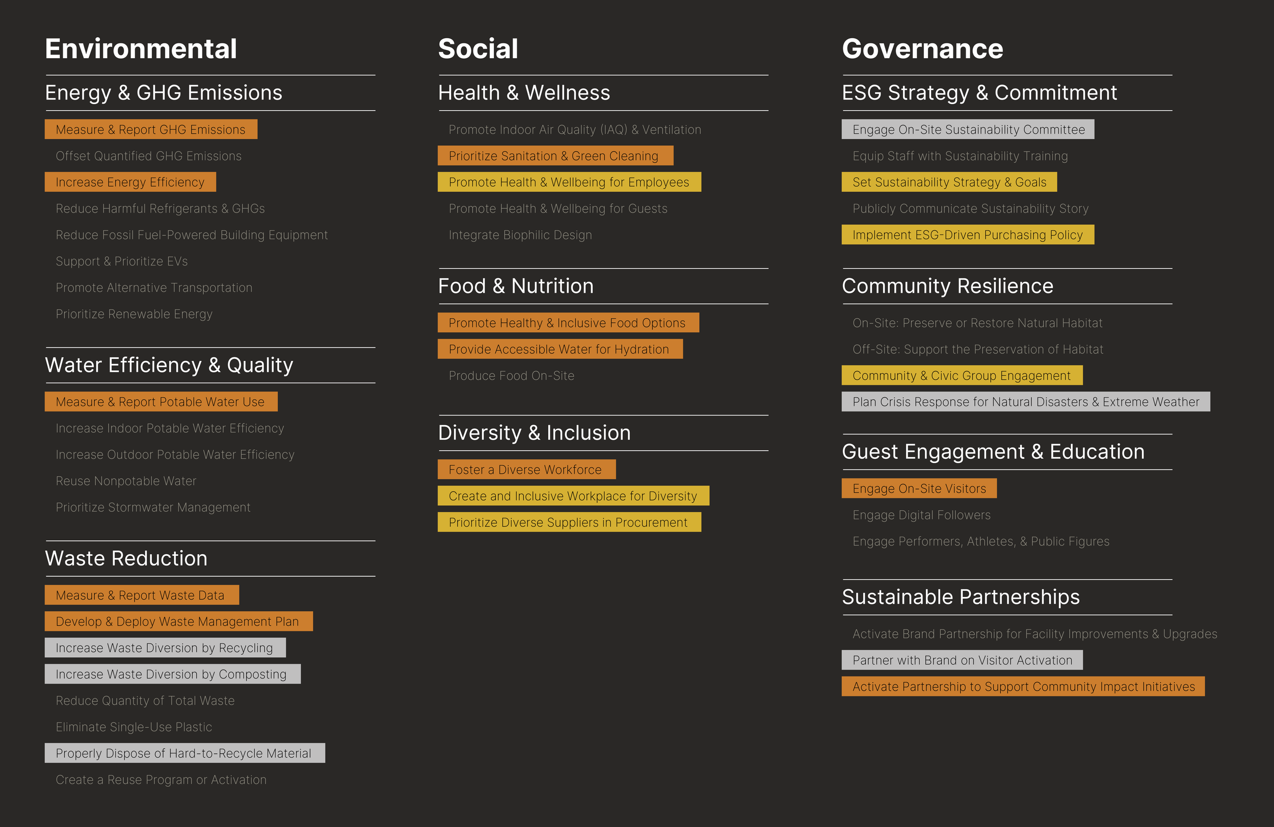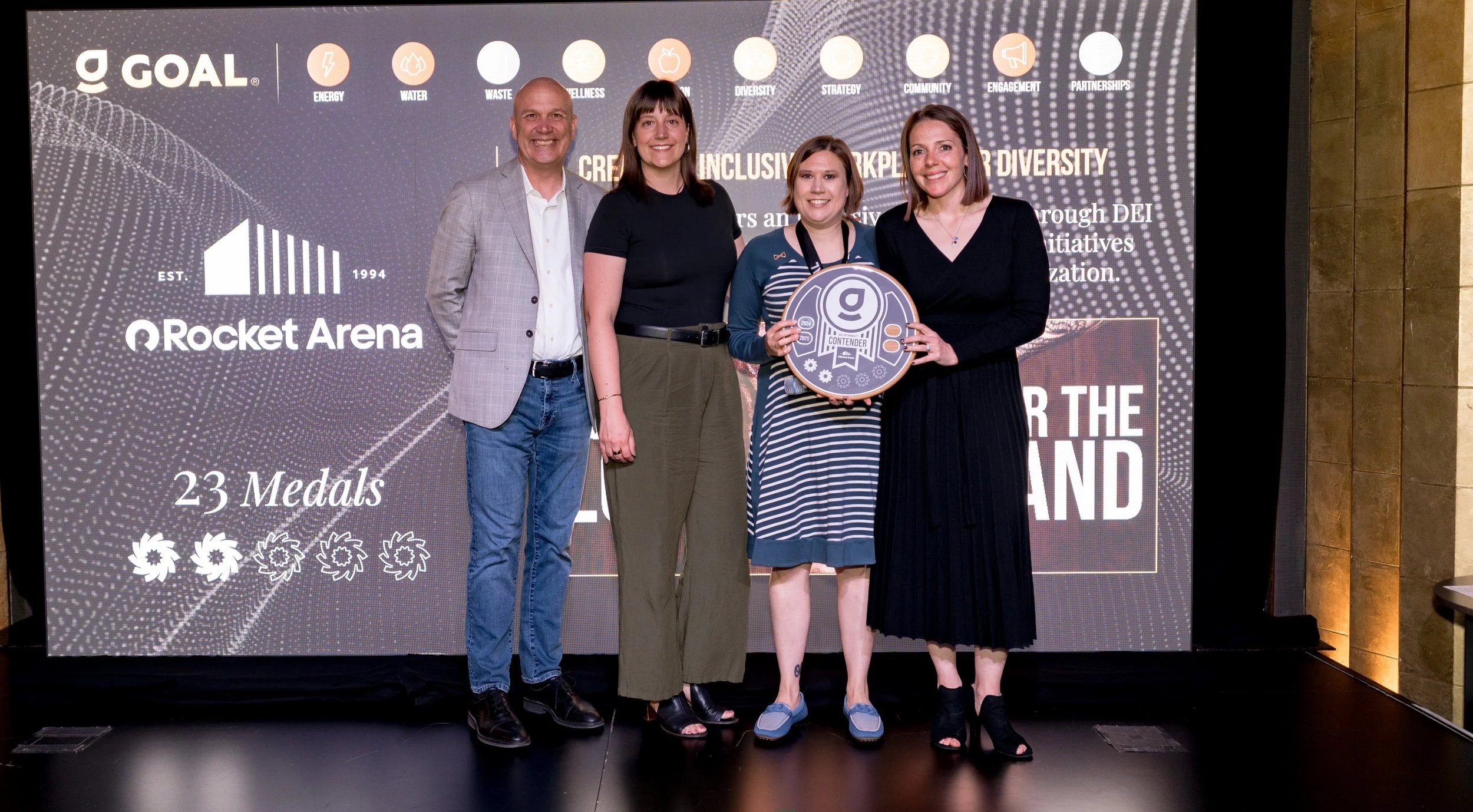 GOAL Medals recognize measurable sustainability achievements across ten categories. The objectives listed below reflect the progress Rocket Arena demonstrated in the current GOAL Medal cycle, highlighting both operational improvements and areas of leadership across the venue.